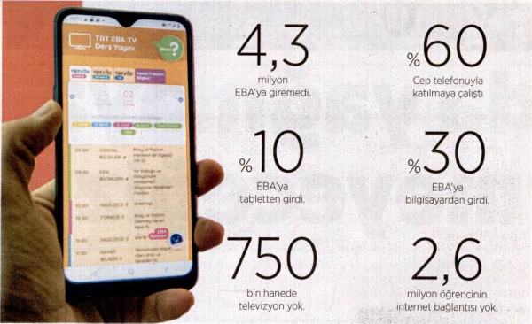 Milli Eğitim Bakanlığı’nın (MEB) uzaktan eğitimin bir yılını kapsayan, “Sayılarla Uzaktan Eğitim” istatistikleri, 4 milyon 360 bin öğrencinin EBA’ya giriş yapamadığını ortaya koydu. EBA’ya giriş yapabilen öğrencilerin ise yüzde 60’ı dersleri cep telefonundan takip etti.