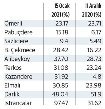 ● Son hafta yaşanan yağmurlar İstanbul’un barajlarının bireysel doluluk oranlarına da yansıdı. Kuraklık nedeniyle yüzde 22’nin altına inen barajların yağışlar sonrasında bir ay önceki oranlara yaklaştığı görüldü. İSKİ’nin yıllık ortalama baraj verilerinde ise geçen yıl Ocak ayında doluluk oranları ortalama 36,67 iken bu yıl 24,66 olarak kaydedildi. İSKİ verilerine göre 11 Aralık ve 12 Ocak tarihleri itibariyle İstanbul’un barajlarında durum şöyle:
