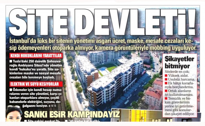Yayla Mahallesi Tuzla’da bulunan 250 dairelik Şahsuvaroğlu Ambiyans Sitesi’nde, inşaat firması geçici olarak site yönetimini üstlendi. Son 3 aydır yönetimin yapmış olduğu bazı uygulamalar ve cezalar site sakinlerini canından bezdirdi. Site yönetiminin vatandaşlara ‘Asgari ücret cezası’ kestiği, işyerlerine kovulmaları için mail attığı, site içinde daire sakinlerine maske takmamak ve sosyal mesafeye uymamaktan ceza kestiği, çocukların çimlerde oyun oynamasının da yasak olduğu iddia edildi.
