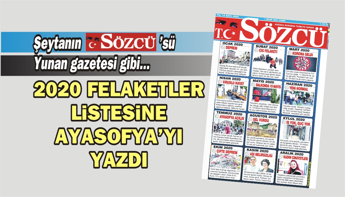 2020 yılında yaşanan felaketleri sıralayan Sözcü gazetesi, Ayasofya'nın ibadete açılmasını da bu felaketler arasında saydı.